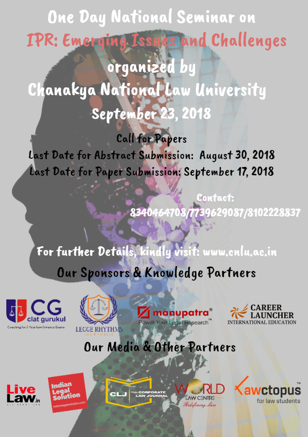 Chanakya National Law University is organizing a one day National Seminar on “Intellectual Property Rights: Emerging Issues and Challenges” which focuses on creating a nation-wide conversation providing an opportunity to students, academicians, law professionals and all other stakeholders to put forward their research and share their knowledge on wide range of topics relating to Intellectual Property Rights and related subjects.