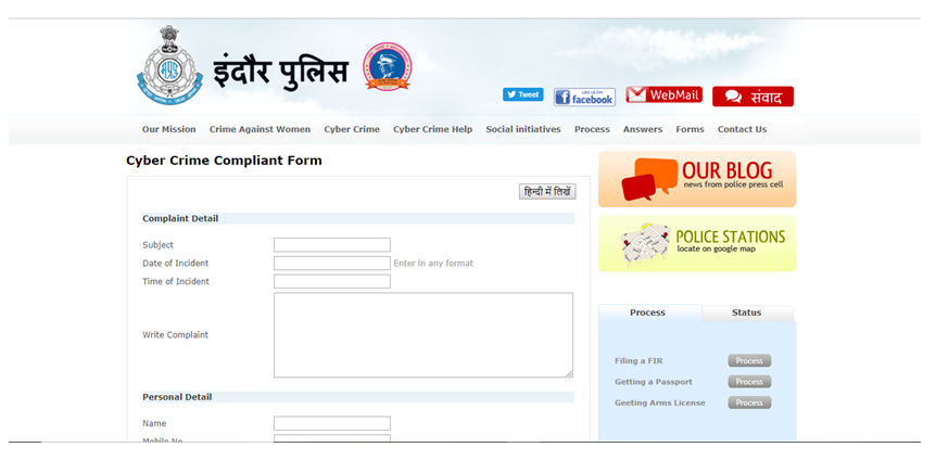 One such example is of the Indore city in Madhya Pradesh, whose website http://www.indorepolice.org/cyber-crime.phpshows the following window: