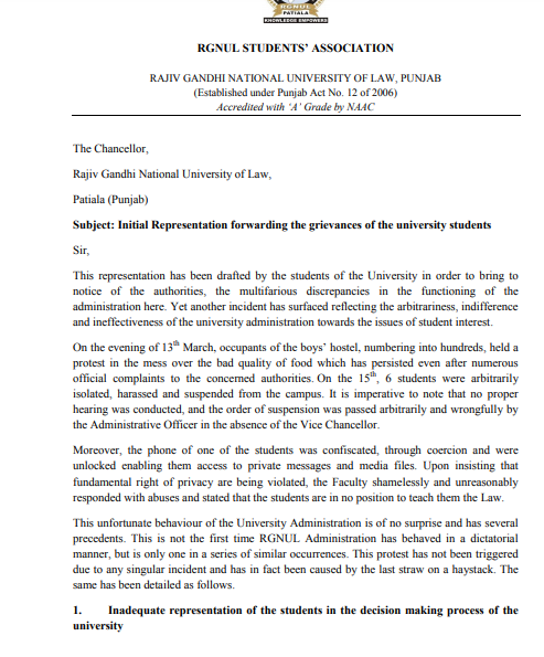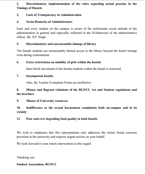It should be noted that in previous years, RGNUL Administration has repeatedly ignored Sexual Harrasment compliant filed by women students against the administration at large with one of the professor filing the case with regard to sexual harassment at Punjab and Haryana High Court.